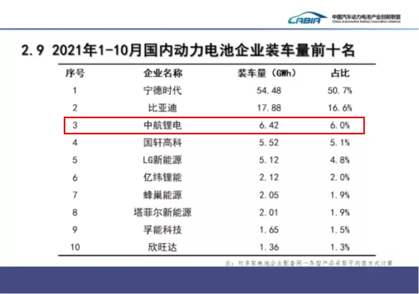 在10月底韓國市場研究機構SNE Research公布的2021年1-9月全球動力電池裝車量排行榜中,中航鋰電以5.6GWh的動力電池裝車量,位居第七。