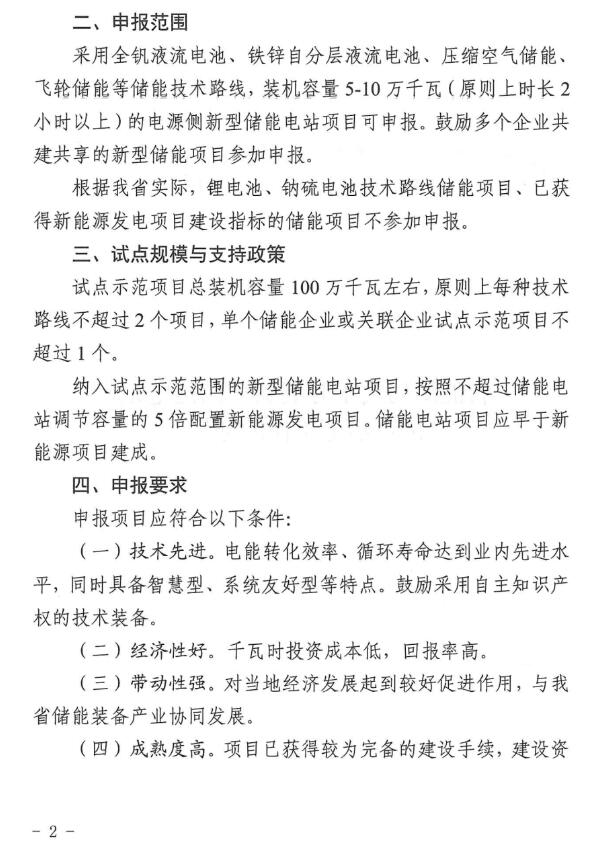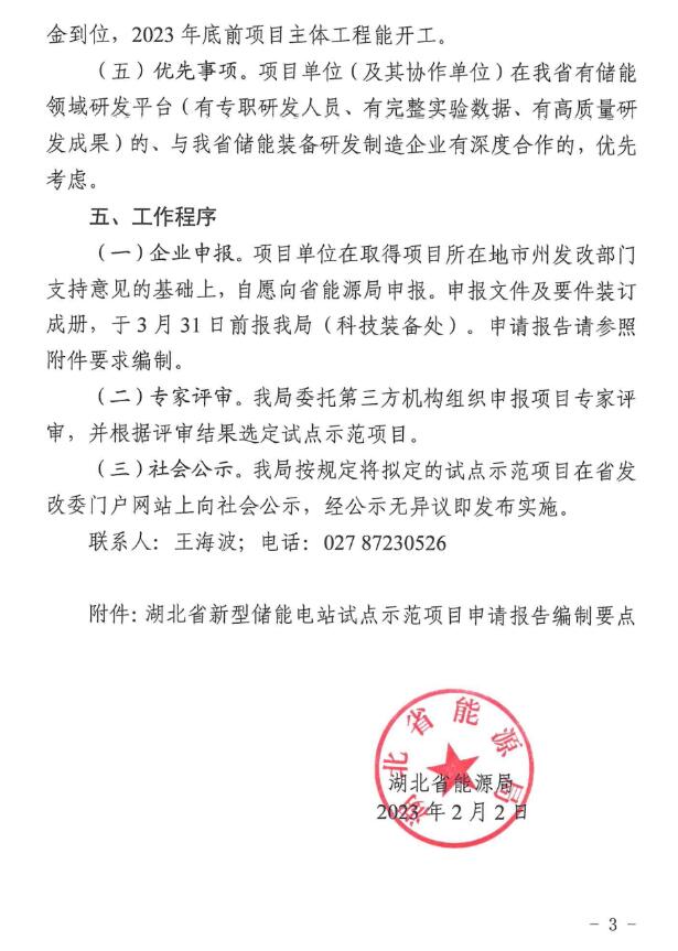 2月3日,湖北省能源局發布了《省能源局關于開展新型儲能電站試點示范工作的通知》。《通知》表示,本次試點釋放項目總裝機規模約1GW左右。原則上每種技術路線不超過2個項目;納入試點示范范圍的新型儲能電站項目,按照不超過儲能電池調節容量的5倍配置新能源發電項目。儲能電站項目應早于新能源項目建成。申報截止時間3月31日。