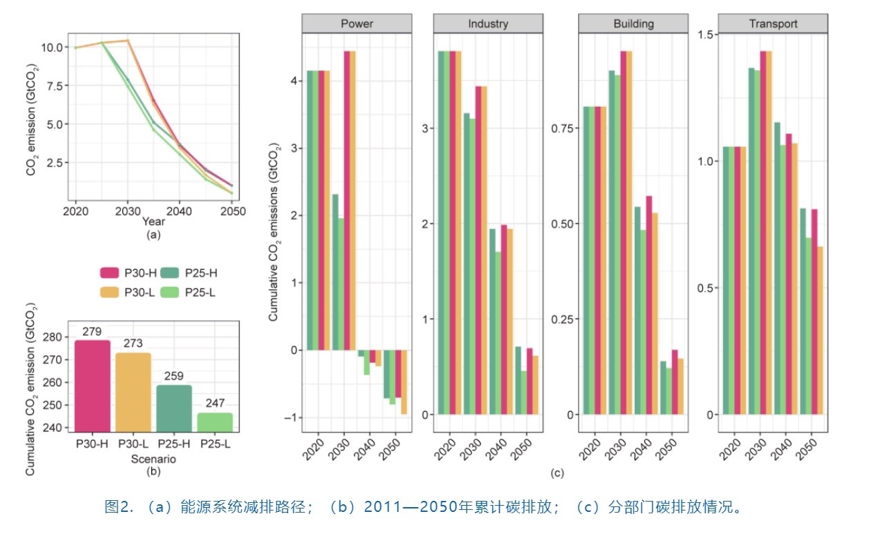 通過多情景比較發(fā)現(xiàn),提前達(dá)峰能夠給中國更多的時間來安排煤電廠的有序退役和可再生能源的平穩(wěn)部署。雖然提前達(dá)峰在短期內(nèi)可能會有更大的轉(zhuǎn)型壓力,但從長遠(yuǎn)來看,這是最具有成本效益的選擇。同時,提前達(dá)峰帶來的累計排放量減少,也將縮小21世紀(jì)下半葉對于負(fù)排放的大量需求。盡管4個情景2050年局地空氣污染物的排放差異不大,但是提前實(shí)現(xiàn)碳達(dá)峰將導(dǎo)致未來15年的空氣質(zhì)量得到明顯改善。2050年更低的排放值會增加整體的減排壓力,這將導(dǎo)致可再生能源和負(fù)排放技術(shù)的進(jìn)一步擴(kuò)張。需求部門在能源轉(zhuǎn)型中也將通過減少能源需求(但增加福利損失)、使用高成本技術(shù)(大規(guī)模使用氫能)等策略來應(yīng)對更為嚴(yán)格的排放約束。