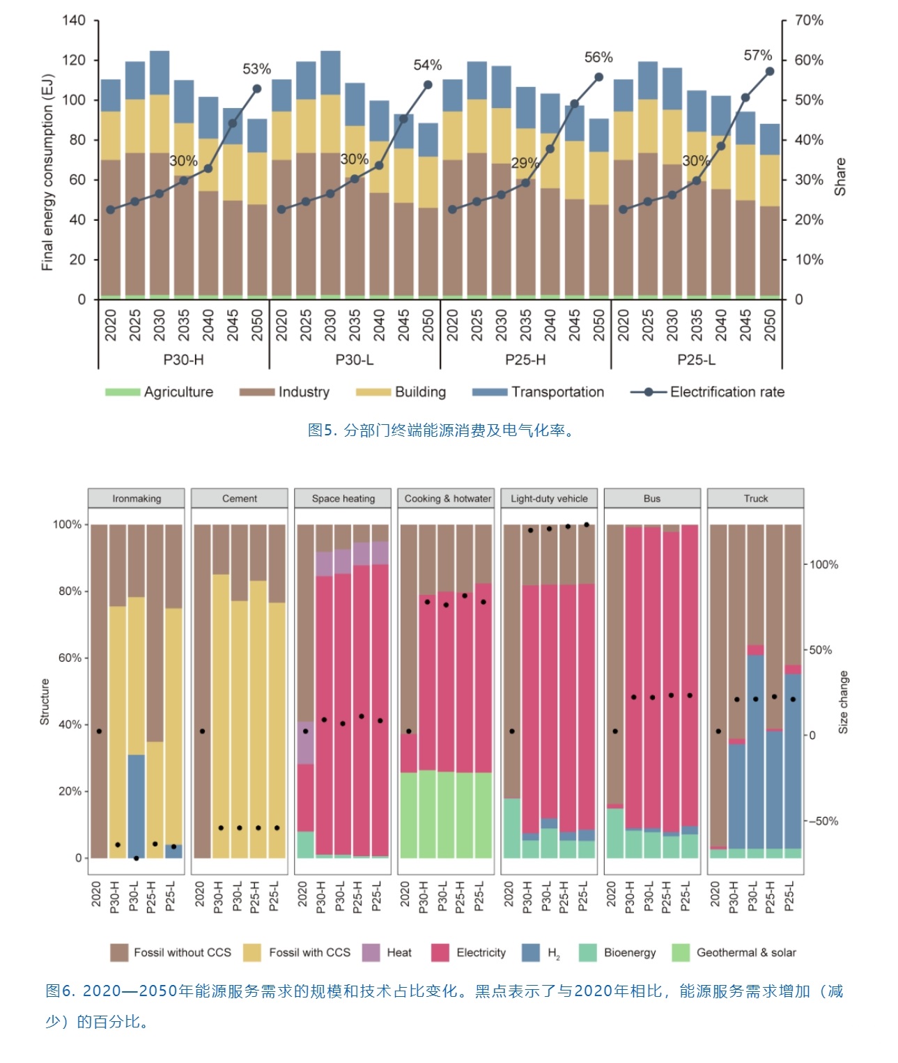 產(chǎn)業(yè)結(jié)構(gòu)調(diào)整、能源效率提高和清潔燃料替代是能源需求部門能耗和排放下降的三大支柱。據(jù)估計,第二產(chǎn)業(yè)在國民經(jīng)濟(jì)中的比重逐年下降,到2050年,這一比重將比2020年減少約9%,而第三產(chǎn)業(yè)比重將增加10%。如圖5所示,對于P30情景,中國的終端能源消費(fèi)將在2030年以125 EJ達(dá)峰,而對于P25情景,達(dá)峰時間將提前到2025年左右,峰值水平也略低(119 EJ)。兩組情景都顯示,2050年中國終端能源消費(fèi)將穩(wěn)定在90 EJ左右。未來的30年,電氣化率將持續(xù)上升,從目前的23%增加到2035年的30%,然后加速達(dá)到2050年的近60%。技術(shù)進(jìn)步和終端能源的電氣化推動能源效率的快速提高。在圖6中,部分能源服務(wù)需求的規(guī)模以及技術(shù)占比變化以圖表的形式展示。