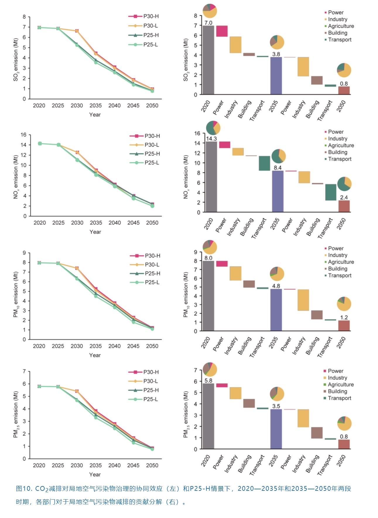 對比不同情景,在2025—2035年,上述4種局地污染物的排放在碳達(dá)峰時間不同的情景下會有明顯的不同。與P30情景相比,P25情景在2030年的SO2、NOx、PM10、PM2.5排放分別減少21%、12%、15%和14%。因此,盡管不同情景下2050年的排放趨于一致,盡早開始碳減排都將產(chǎn)生更多的近期收益。
