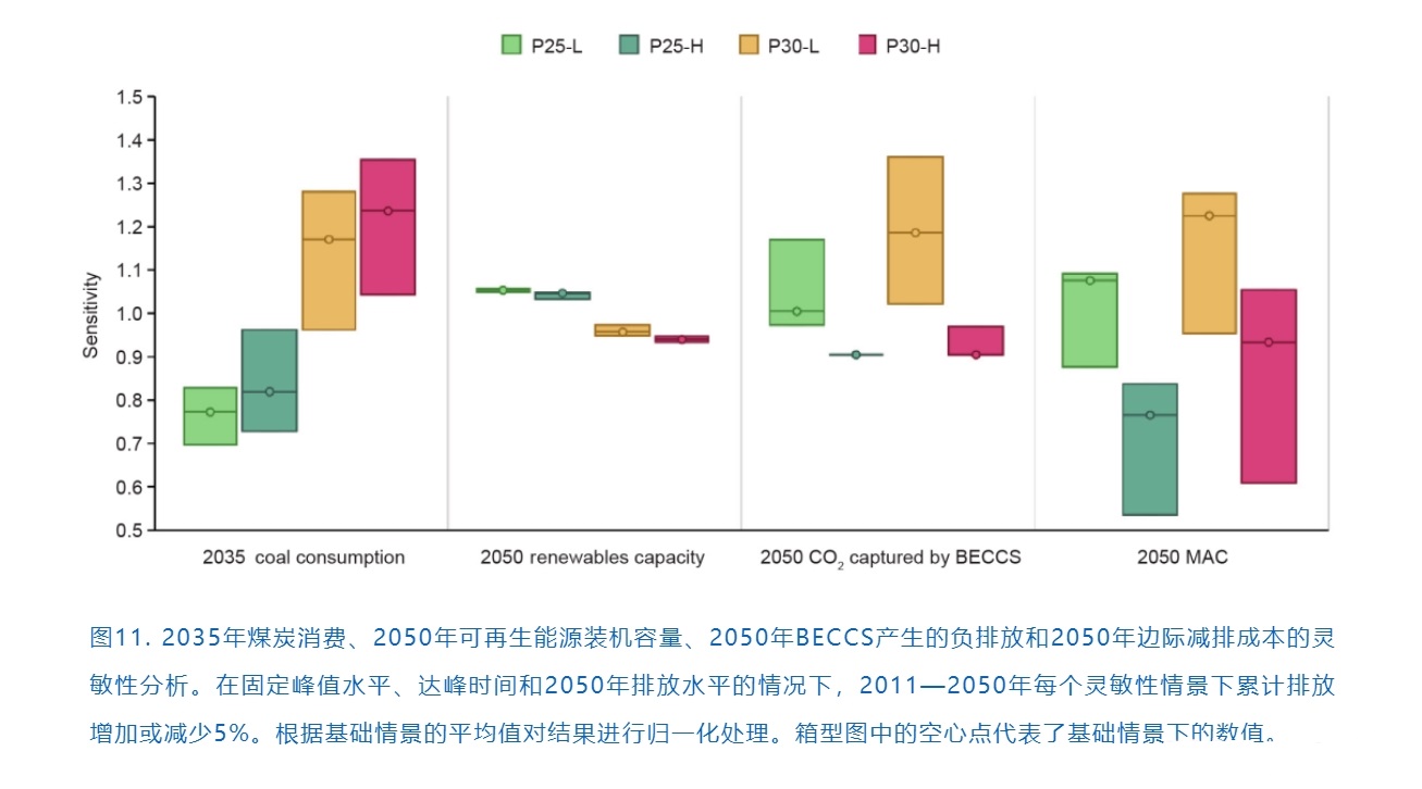 盡管BECCS技術(shù)的部署受到累計排放量變化的重大影響,但提前達(dá)峰能夠減少對碳移除技術(shù)的依賴并減少由累計排放量不確定性帶來的波動。由于所有部門在2050年都已經(jīng)深度脫碳,因此所有情景都顯示出了對BECCS的巨大需求,其中P25-L和P30-L情景有更高的普及率。與碳移除技術(shù)類似,MAC受到累計排放量的影響較大。較晚達(dá)峰和更嚴(yán)格的長期排放目標(biāo)都會增加MAC,產(chǎn)生更大的減排壓力,提前達(dá)峰能夠在實(shí)現(xiàn)長期目標(biāo)中占據(jù)主動地位。