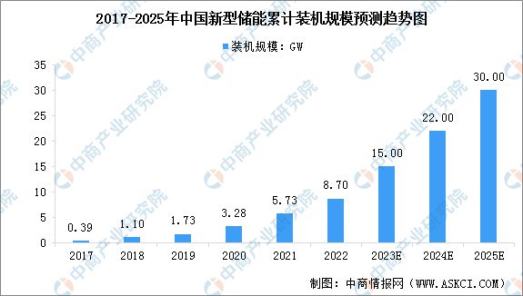 截至2021年底,我國已投運的新型儲能裝機規模達5.73GW,同比增長74.70%。根據國家能源局發布的相關數據,截至2022年底,全國已投運新型儲能項目裝機規模達8.7GW,平均儲能時長約2.1小時。根據《關于加快推動新型儲能發展的指導意見》,預計到2025年國內新型儲能裝機規模將增至30GW。