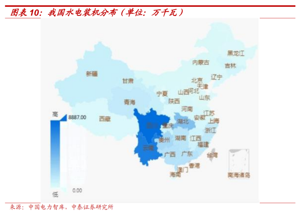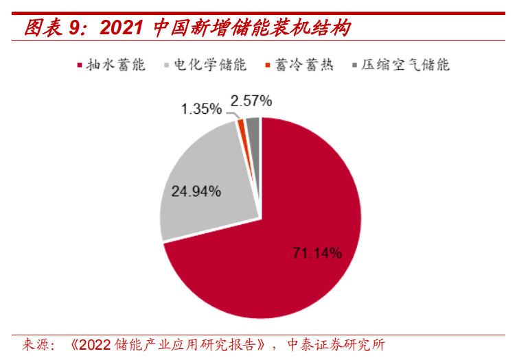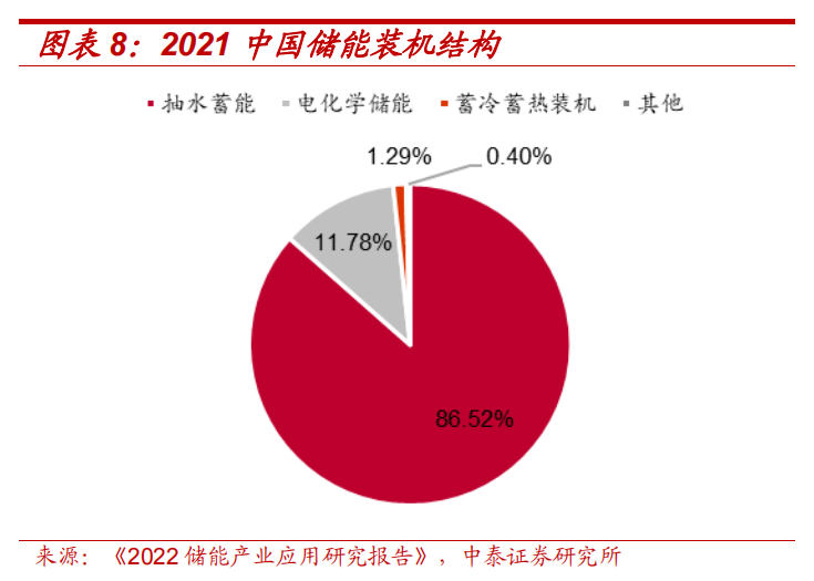 2021年中國抽水蓄能裝機功率38GW,占比全部儲能的86.52%,電化學儲能裝機功率5GW,占比11.78%,抽水蓄能是我國存量儲能的主要形式。2021年中國新增抽水蓄能裝機5GW,占比71.14%,電化學儲能新增2GW,占比24.94%,電化學儲能裝機增速超過抽水蓄能。抽水蓄能需要尋找合適地形及水域,同時可能涉及搬遷移民問題,外部限制因素較多,建設期通常長達數年。我國水電資源主要集中在南方地區尤其是西南地區,西北等地區缺發建設大型抽蓄配套新能源的條件。而電化學儲能則對外界條件要求不高,建設期較短,單體投資小,因而成為新能源配儲的普遍選擇。