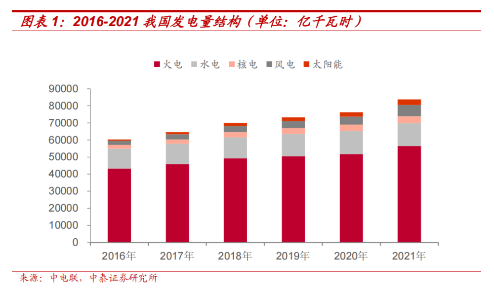 截至2021年,我國風電裝機規模328.48GW,光伏裝機規模 306.56GW。2021年風電發電量為6556億千瓦時,占比7.83%,太陽能發電量3270億千瓦時,占比3.91%,發電量合計占比 11.74%,較2016年的5.10%提升6.64pct。
