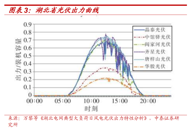 是一天中的最低位。光伏出力曲線和負荷曲線相對更適配,白天為曲線高位,但以湖北省為例,20時至23時負荷仍處于相對高位,而此時光伏出力為0。因此當新能源發電量占比達到一定程度,電源和負荷的曲線差異將對電網的運行效率和安全造成沖擊,或導致大量棄風棄光現象。