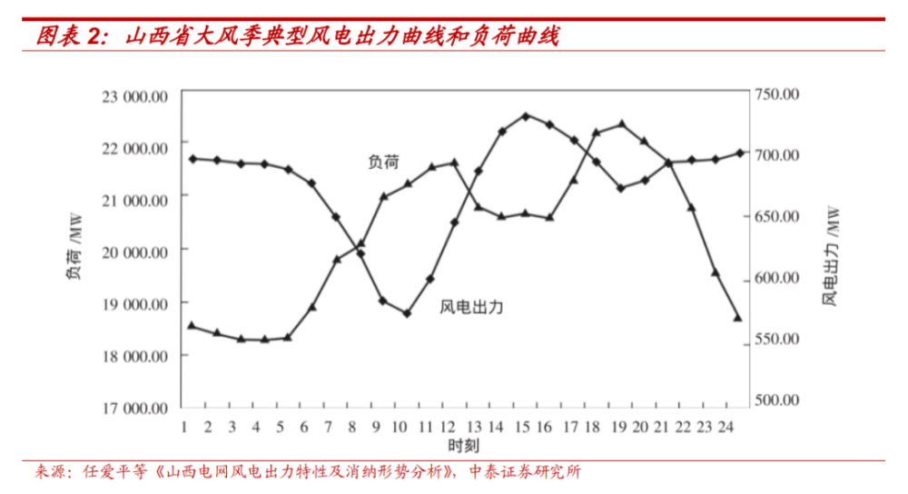 根據山西省大風季典型風電出力曲線和負荷曲線可見,風電出力和負荷二者具有較大差異,風電在21時至次日5時出力處于相對高位,而此時用電負荷卻