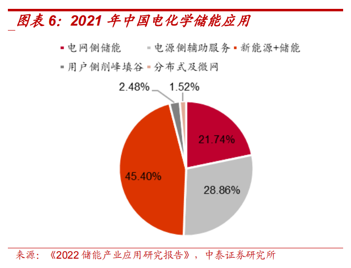 2021年起,各省密集發布新能源項目配套儲能政策,配臵比例主要在 10%-20%區間,配臵時長1-2小時,推動我國電化學儲能高速增長。根據《2022儲能產業研究報告》,2021年我國新能源配儲占電化學儲能應用的45.40%,我國電化學儲能主要應用在電源側和電網側來支持風光新能源消納和新型電力系統建設。