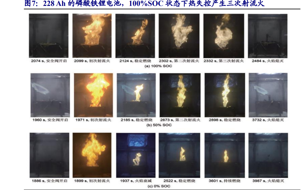 在模擬燃燒實(shí)驗(yàn)中,鋰電池的燃燒過(guò)程包括受熱鼓脹、初次射流火、穩(wěn)定燃燒、 多次射流火、火焰熄滅等過(guò)程。不同 SOC(電池中剩余的電荷余量,100%為滿(mǎn)電)狀態(tài)下,鋰電池會(huì)產(chǎn)生 2-3 次射流火,100%狀態(tài)下熱失控溫度僅為 167℃,而燃燒 峰值溫度將達(dá)到 573℃。