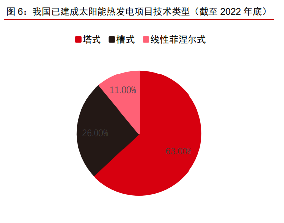 我國已建成光熱項目中,塔式光熱占比相對較高。根據 CSTA 數據,截至 2021 年底, 全球太陽能熱發電累計裝機容量達到 6.8GW,槽式、塔式、線性菲涅耳技術裝機在全球主 要國家和地區的占比為 76%、20%和 4%。截至 2022 年底,我國太陽能熱發電累計裝機 容量為 588MW(含 MW 級以上規模的發電系統),塔式光熱電站雖然前期系統建設一次性投資較大且維護成本較高,但更適合我國西部地區晝夜溫差大、缺少水資源、自然環境 惡劣等特點,同時因槽式系統和線菲式系統集熱效率偏低、對工質加熱能力較弱等因素, 因而在我國塔式光熱電站應用范圍相對較廣。