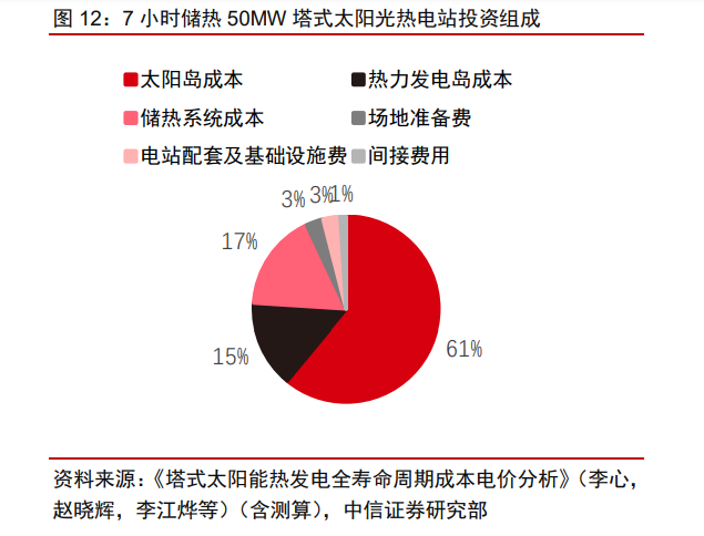 塔式太陽能熱電站中太陽島建設成本是電站建設的主要成本。太陽能熱發電站建造成 本主要分設備費、安裝費和土建費三部分。綜合《塔式太陽能熱發電全壽命周期成本電價 分析》(李心,趙曉輝,李江燁等著)的測算數據來看,對于 10MW 以上的塔式太陽能熱 發電站而言,太陽島(含聚光系統和吸熱系統)成本占電站建造成本的 55%以上;以 50MW 塔式太陽能熱發電電站為例,其太陽島成本高達 61%,熱力發電島(含熱力系統及輔機設 備、水循環、水處理系統、換熱設備、熱工控制系統、電氣系統、電網接入系統及儀表閥 門管路等)成本約 15%,儲熱系統成本約 17%。