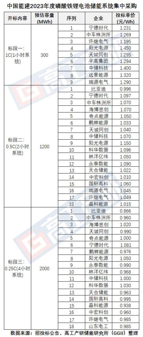 值得關注的是,7月18日,中國能建2023年度磷酸鐵鋰電池儲能系統集中采購開標。本次集采共分為3個標段,總采購量3.5GWh,項目主要分布于全國,共有21家儲能企業入圍。