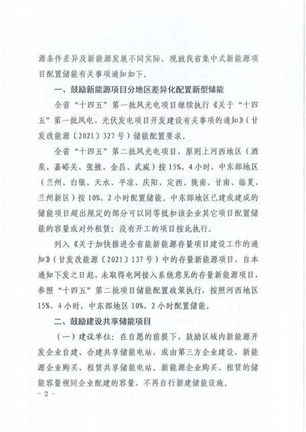 “十四五”第二批風光電項目:河西地區(酒泉、嘉峪關、張掖、金昌、武威)配置儲能為15%,連續時長4小時;中東部地區(蘭州、白銀、天水、平涼、慶陽、定西、隴南、甘南、臨夏、蘭州新區)配置儲能為10%,連續時長2小時。