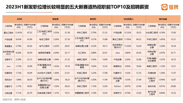 獵聘大數據研究院發布的《2023上半年就業趨勢大數據洞察》顯示,AIGC(人工智能生成內容)、新能源、新材料、對話機器人、綠色低碳五個賽道的新發職位今年上半年同比增長相對明顯,其中新能源位列第二位,數量同比增長42.49%。