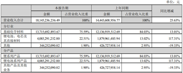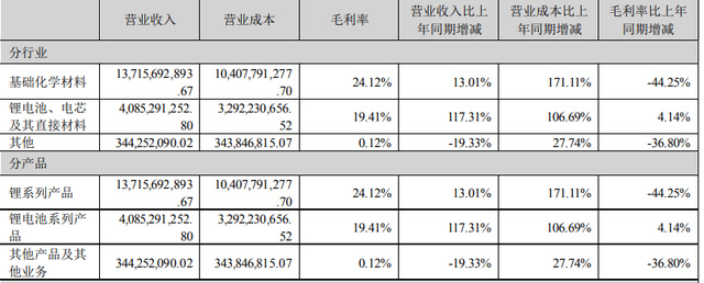 今年上半年,贛鋒鋰業的鋰電池系列產品營業收入達到40.85億元,同比增長117.31%,占比首度突破20%達到22.5%,毛利率更是增長了4.14個百分點到19.41%,成為贛鋒鋰業唯一實現毛利率正增長的業務。