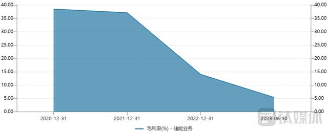 而細看公司儲能業務的毛利率,可以得知自2020年開始,該業務毛利率逐年下滑,其中2022年的下降幅度最為明顯。相關數據顯示,2020年—2022年及2023年上半年,儲能業務的毛利率分別為38.53%、37.17%、14.05%及5.41%。