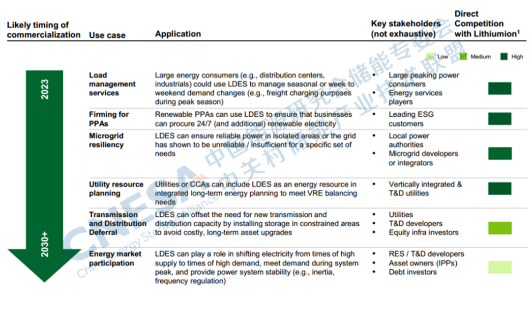 從應用場景上講,LDES在用電負荷管理,電力購買協議,微網韌性和電力資源規劃等應用場景與鋰電有較強的競爭關系,而在推遲輸配電網建設和參加電力市場方面的競爭關系相對較弱。