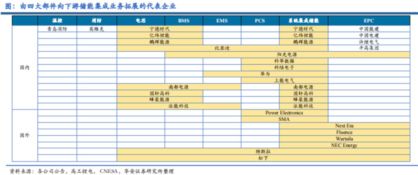 比如寧德時(shí)代、億緯鋰能等公司從電池進(jìn)入系統(tǒng)集成;陽(yáng)光電源、科陸電子、上能電氣從PCS進(jìn)入系統(tǒng)集成等。也有比亞迪這樣電芯、PCS、BMS、EMS、系統(tǒng)集成全產(chǎn)業(yè)鏈布局的一體化。