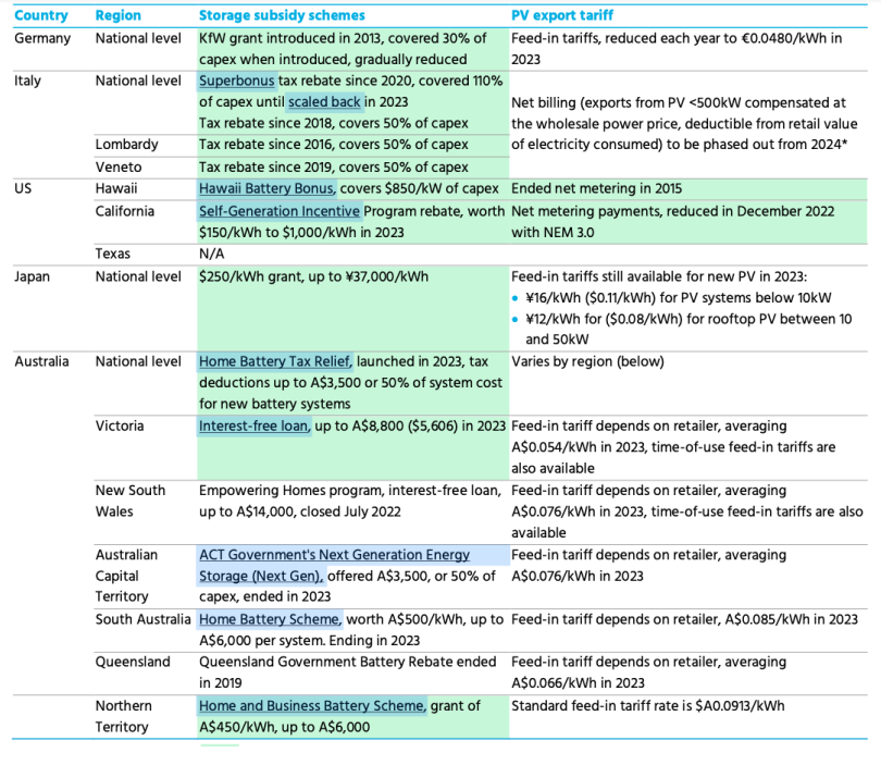 注:綠色=支持戶用儲能普及的主要驅動因素。*=意大利對新光伏系統的凈計費政策將于2024年1月1日終止,而現有系統需要在2024年年底前逐步轉為補償較低的計劃,補償金額約為100歐元/MWh,具體取決于生產時間和地區。日本的光伏輸出電價適用于10-50kW的光伏系統。