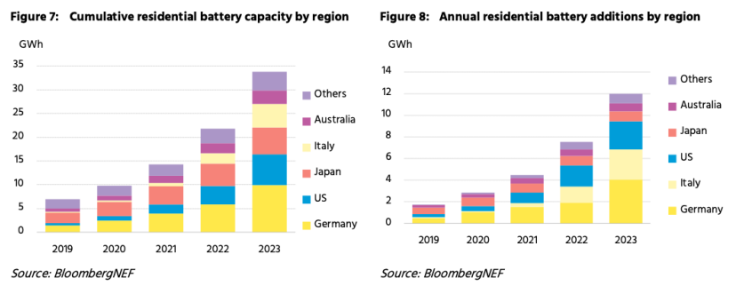 圖1:BNEF累計戶用儲能預期 圖2:2023年太陽能電池安裝率,選定市場