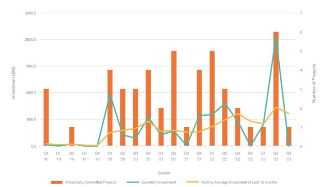 在今年第二季度,包括Waratah Super Battery電池儲能項目在內的六個大型電池儲能系統獲得投資承諾,首次在一個季度內突破10億澳元大關。而在今年第三季度,只有一個儲能項目獲得投資,是一個在采礦場部署的太陽能+儲能混合項目。