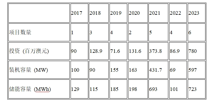 澳大利亞清潔能源委員會報告中的一個表格表明,就調試和投資金額而言,2023年將成為迄今為止大型電池儲能系統投資規模最大的一年: