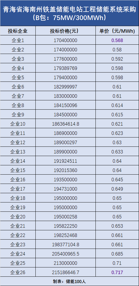 B包:規模為75MW/300MWh,共吸引了26家企業投標,最低報價為0.568元/Wh,最高報價為0.717元/Wh。(投標報價詳情見下圖)