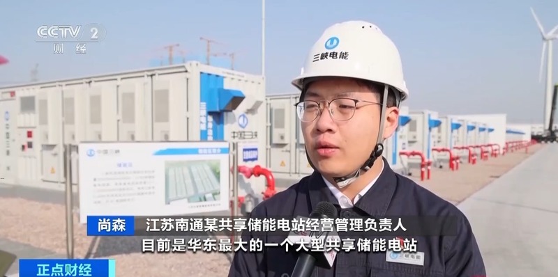在江蘇南通市洋口鎮(zhèn),緊鄰著風(fēng)電光伏項目的是一排排由白色儲能艙構(gòu)成的共享儲能電站。負(fù)責(zé)人表示,這個項目于11月29日并網(wǎng)運行,投資超過7.9億元。可以將周圍多個風(fēng)電和光伏電站發(fā)出的多余電量存儲起來,給居民區(qū)或工業(yè)企業(yè)供電。
