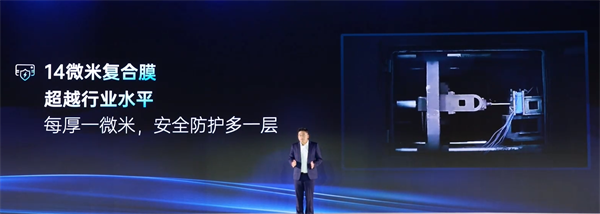 在安全防護(hù)方面,億緯鋰能也有多重創(chuàng)新設(shè)計,首先在電池隔膜方面選擇了14微米復(fù)合膜,超越行業(yè)水平。與此同時,億緯還開發(fā)了具有熱關(guān)斷的效應(yīng)的特殊隔膜涂層,當(dāng)溫度達(dá)到臨界值,涂層顆粒會融化關(guān)斷鋰離子的遷移,從源頭阻斷電芯熱失控的發(fā)生。