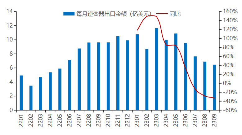 2023年9月國內出口光儲逆變器金額6.5億美元,同比-33%,環比-6%;