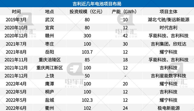 吉利近幾年電池業務布局(據公開報道統計)
