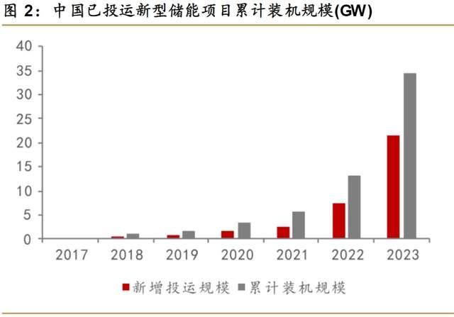 2023年中國新增投運新型儲能項目裝機規模21.5GW/46.6GWh,是2022年新增投運規模的3倍,預計2024年國內全年新增裝機將超過35GW,保持高速增長。
