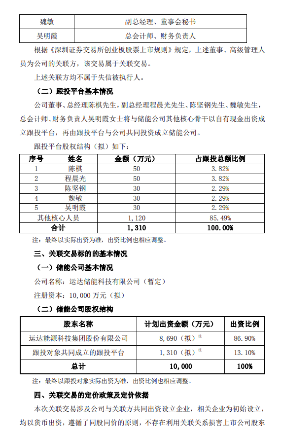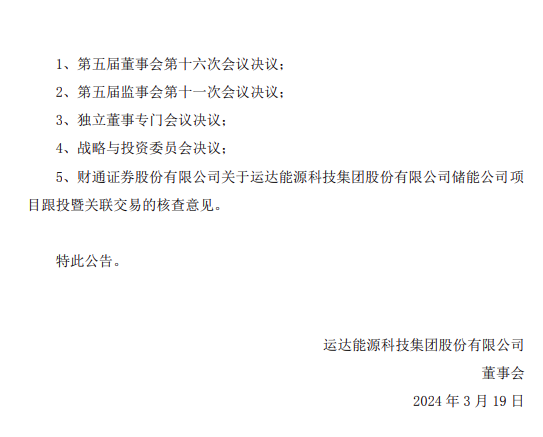 3月19日,運達股份發布《關于儲能公司項目跟投暨關聯交易的公告》。