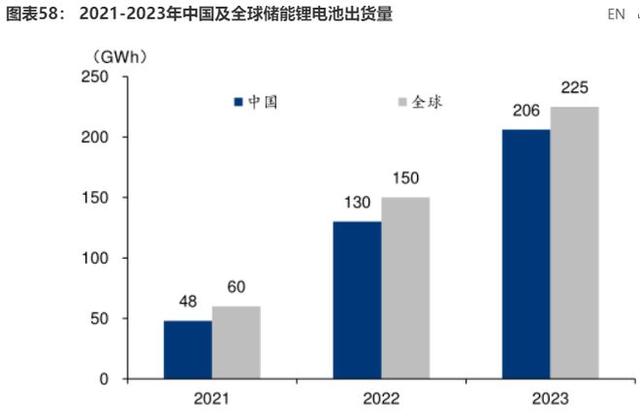 首先,鋰電池儲能在新型儲能裝機中占據絕對主導地位,將在較長時期作為儲能建設的主力,因此,儲能也成為鋰電池廠商兵家必爭之地。根據GGII,2023年全球儲能鋰電池出貨225GWh,同比增長50%,其中我國儲能鋰電池出貨206GWh,同比增長58%。國內企業出貨在全球占比由2022年的86.7%提升至2023年的91.6%,寧德時代、比亞迪、億緯鋰能、瑞浦蘭鈞、海辰儲能等企業出貨領跑行業。