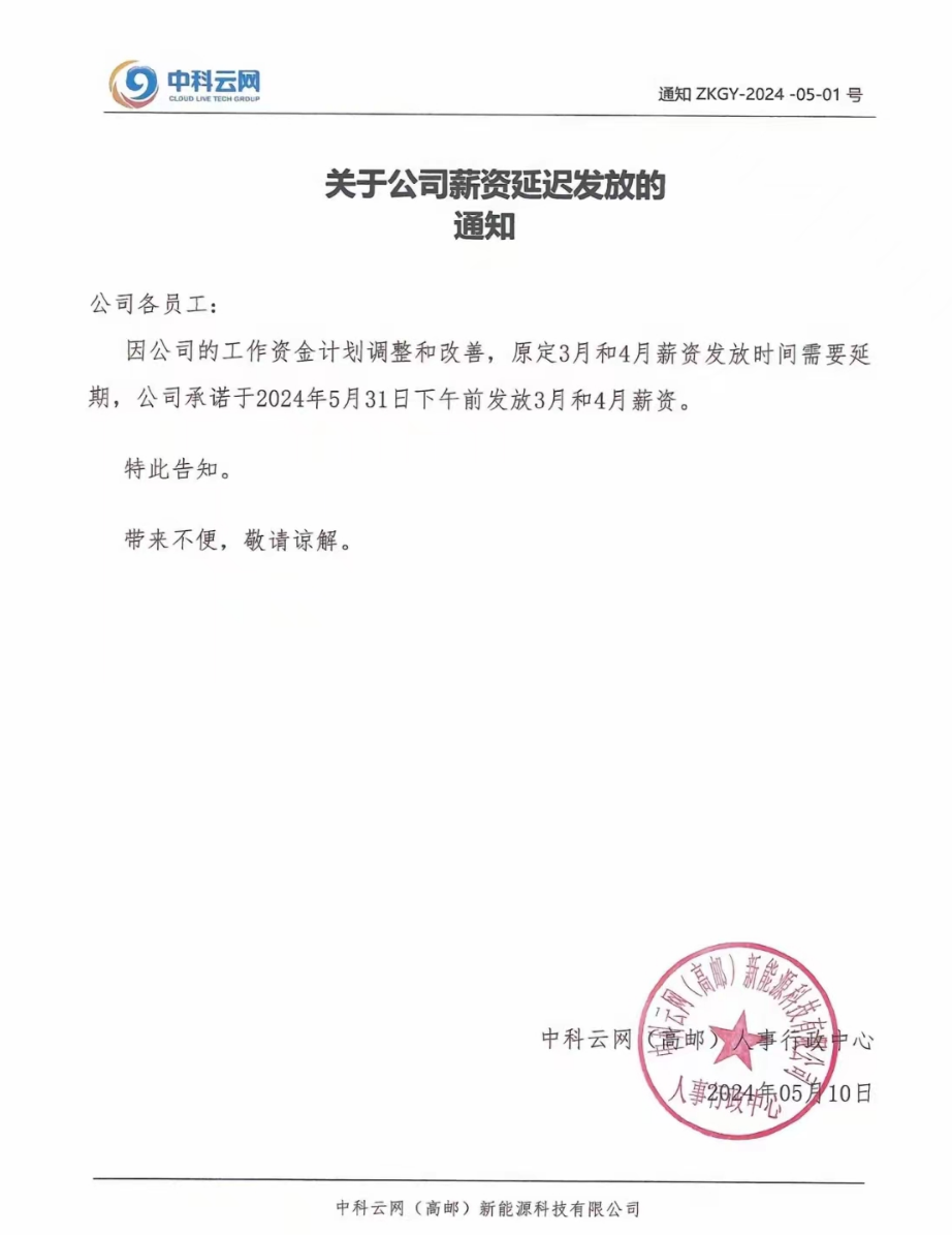 上述延遲發放薪資的通知中指出,因公司的工作資金計劃調整和改善,原定3月和4月薪資發放時間需要延期,公司承諾于5月31日下午前發放。