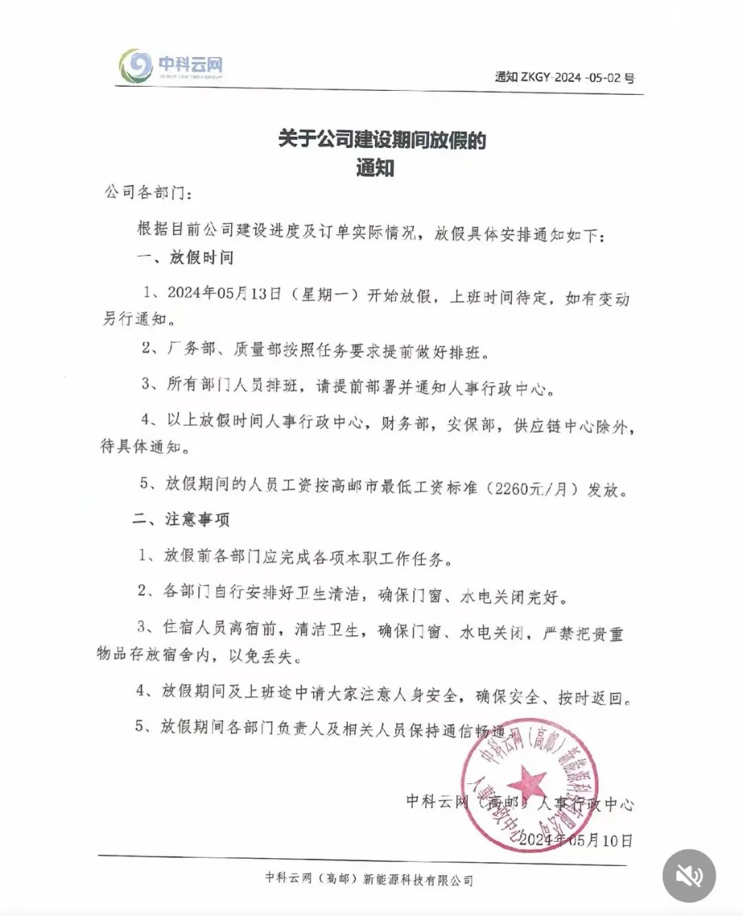 《放假通知》則指出,根據公司的建設進度及訂單實際情況,除了人事行政中心、財務部、安保部和供應鏈中心外,公司于5月13日開始放假,上班時間待定。放假期間的人員工資按照高郵市最低工資標準(2260元/ 月)發放。