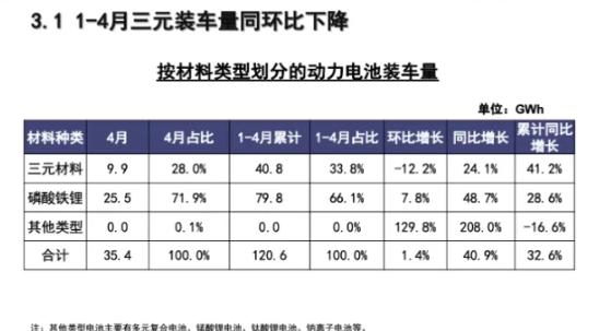 中國(guó)汽車(chē)動(dòng)力電池產(chǎn)業(yè)創(chuàng)新聯(lián)盟4月統(tǒng)計(jì)數(shù)據(jù)顯示,磷酸鐵鋰電池裝車(chē)量占總裝車(chē)量71.9%。