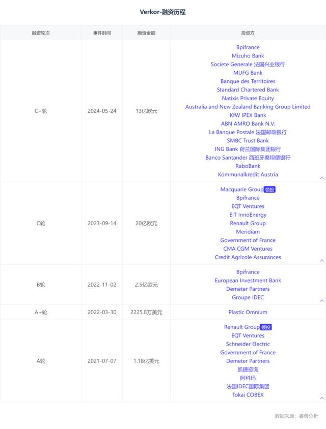 睿獸分析數(shù)據(jù)顯示,Verkor在大約一周前宣布了獲得13億歐元的貸款,資金來(lái)自法國(guó)興業(yè)銀行、荷蘭國(guó)際集團(tuán)銀行、法國(guó)郵政銀行、西班牙桑坦德銀行等19家銀行。