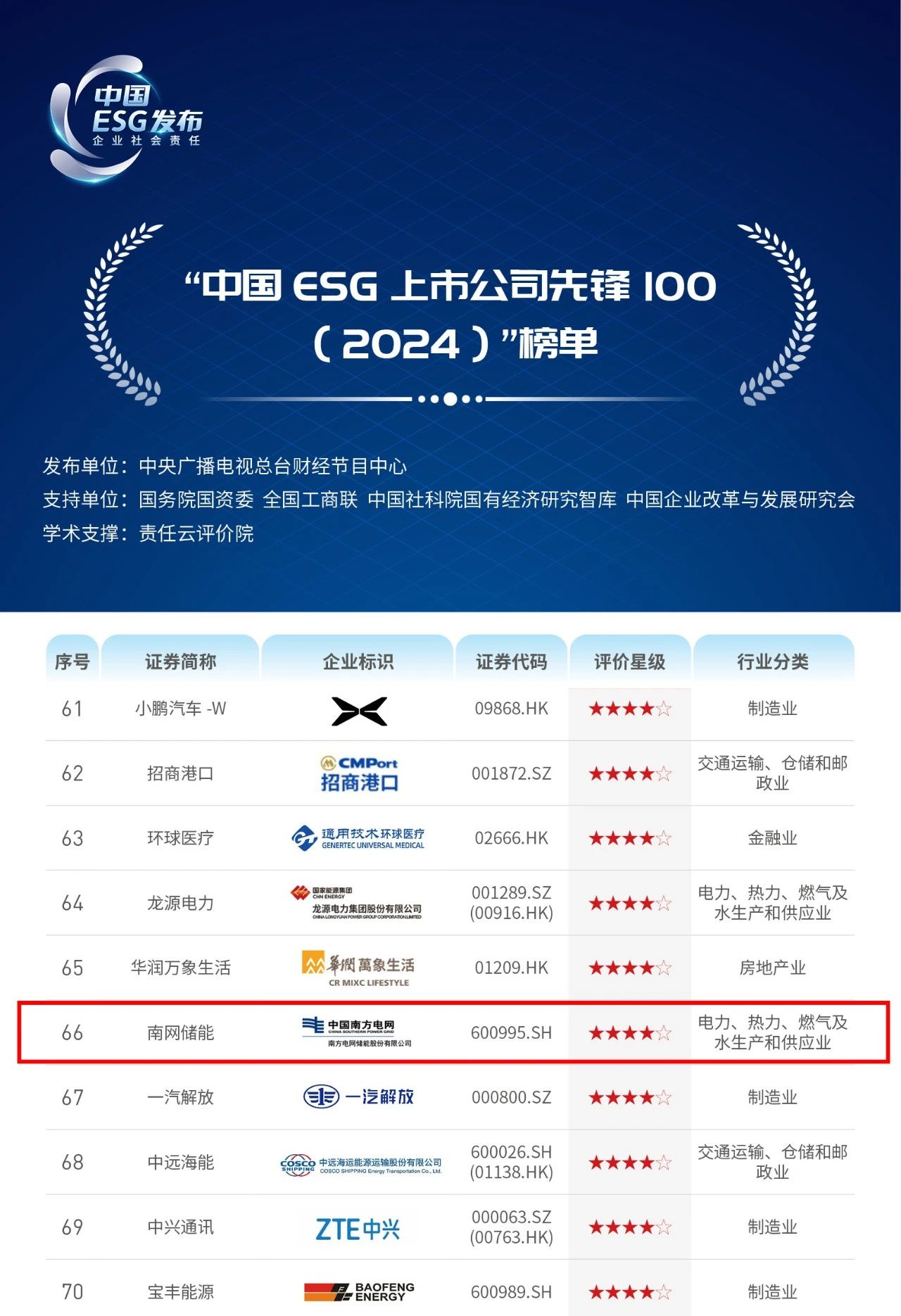 近日,中央廣播電視總臺財(cái)經(jīng)節(jié)目中心在北京正式發(fā)布《2024年度ESG行動報告》,入圍《報告》的100家“中國ESG上市公司先鋒100”企業(yè)中,南方電網(wǎng)儲能股份有限公司(以下簡稱“南網(wǎng)儲能”)憑借在環(huán)境、社會和公司治理等方面的履責(zé)成效,從6471家中國上市公司樣本池、972家上市公司評價樣本中脫穎而出,蟬聯(lián)該榜單,位列第66位,較去年排名提升26位。