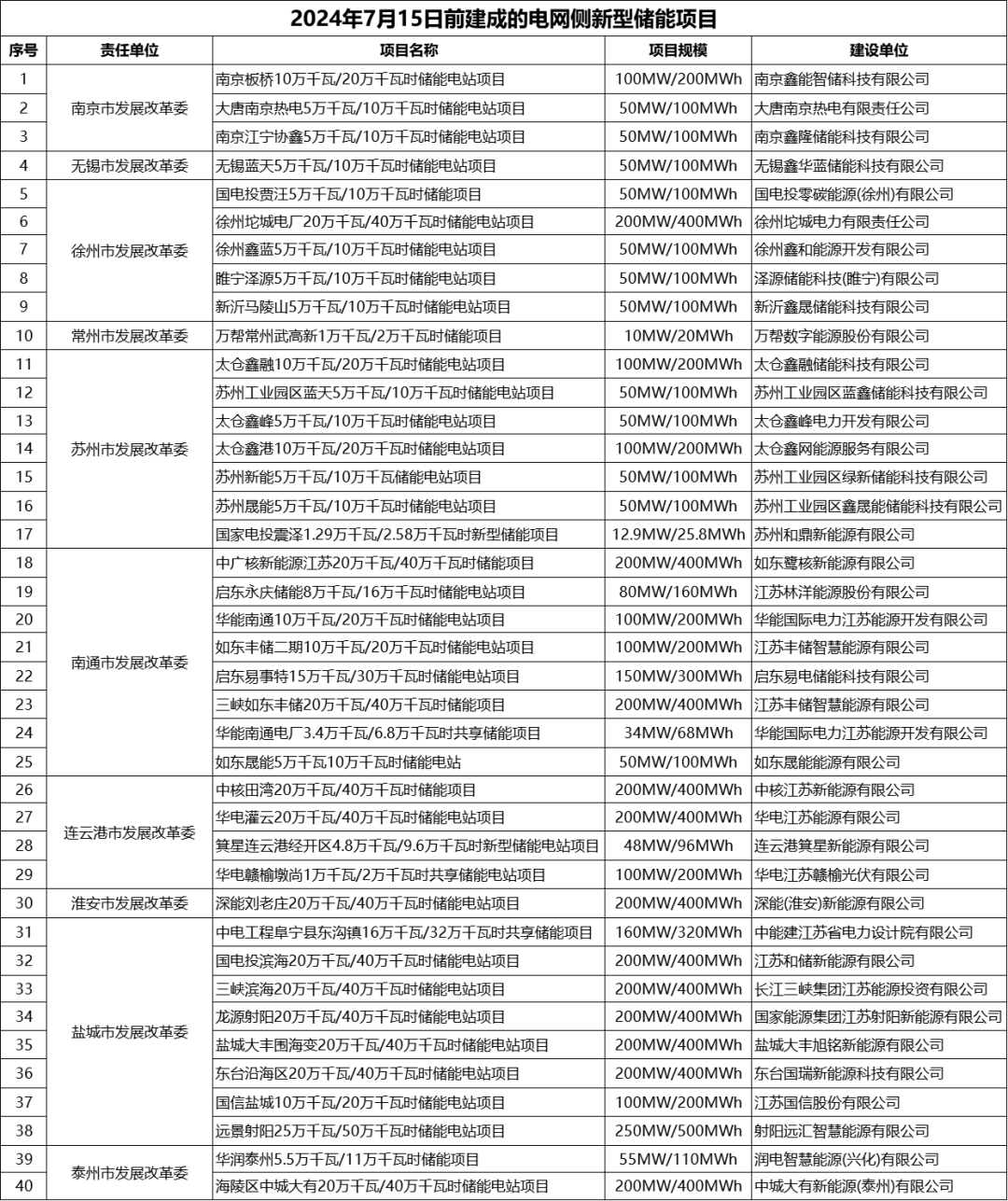 根據(jù)江蘇省2024年7月15日前建成的電網(wǎng)側(cè)新型儲能項目清單: