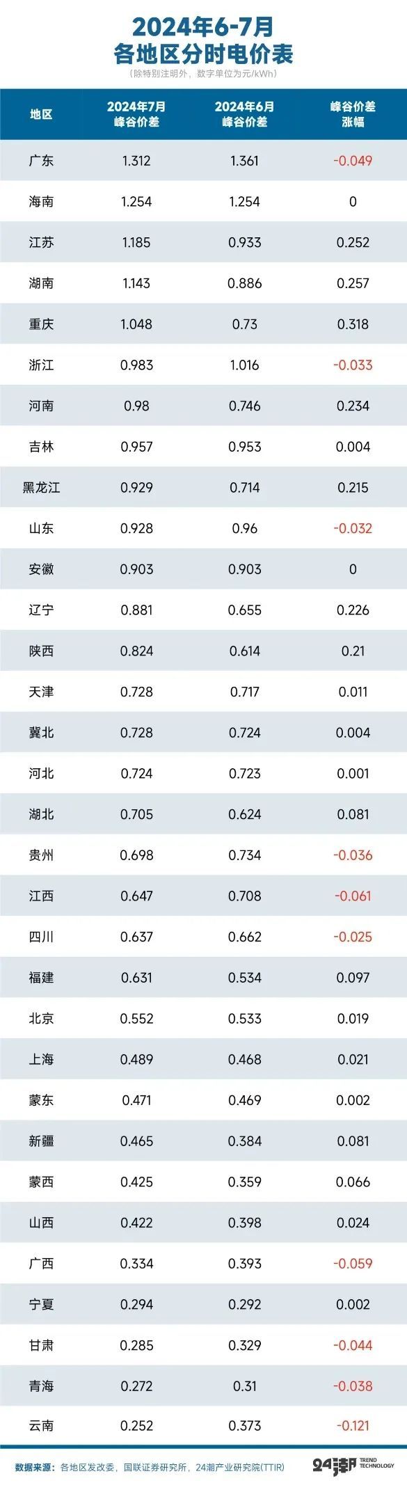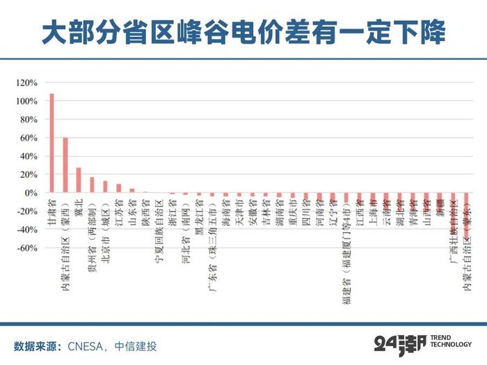 這并非危言聳聽(tīng),根據(jù)東海證券統(tǒng)計(jì),今年以來(lái)浙江、河南、江蘇多地發(fā)布分時(shí)電價(jià)調(diào)整政策,全國(guó)范圍內(nèi)峰谷電價(jià)差縮窄趨勢(shì)顯著,河南省分時(shí)電價(jià)調(diào)整新政亦正式落地。此外根據(jù)中關(guān)村儲(chǔ)能聯(lián)盟對(duì)32個(gè)省區(qū)的分析,今年1-8月份一般工商業(yè)1-10kV電網(wǎng)代理購(gòu)電最大峰谷價(jià)差平均為0.68元/kWh,較2023年同比下降了6.7%。與2023年1-8月相比,今年各地最大峰谷價(jià)差普遍呈現(xiàn)下降趨勢(shì),僅甘肅、蒙西、冀北等8個(gè)地區(qū)價(jià)差有所提高,其他地區(qū)均為下降。