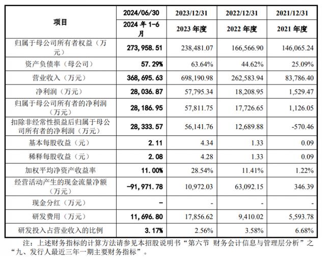 2021年-2024年上半年,其向前五名客戶合計的銷售額占營業收入的比例分別為78.16%、83.70%、74.37%和58.43%。