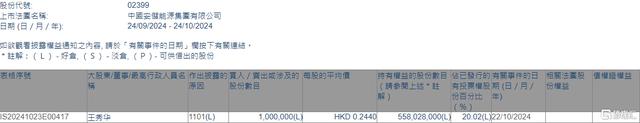 根據聯交所最新權益披露資料顯示,2024年10月22日,中國安儲能源(02399.HK)獲股東王秀華在場內以每股均價0.244港元增持100萬股,涉資約24.4萬港元。