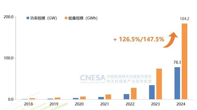 據CNESA DataLink全球儲能數據庫統計,截至2024年底,我國電力儲能累計裝機量實現重大突破,首次突破百吉瓦大關,達到137.9GW。其中,新型儲能裝機規模首次超過抽水蓄能,達到78.3GW/184.2GWh,功率和能量規模同比增長分別達到126.5%和147.5%。這一數據標志著中國新型儲能產業發展進入新的歷史階段。