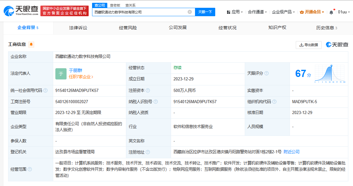 近日,西藏軟通動(dòng)力數(shù)字科技有限公司成立,法定代表人為于麗群,注冊(cè)資本500萬人民幣,經(jīng)營范圍包括數(shù)字文化創(chuàng)意軟件開發(fā)、數(shù)字內(nèi)容制作服務(wù)、物聯(lián)網(wǎng)應(yīng)用服務(wù)、互聯(lián)網(wǎng)數(shù)據(jù)服務(wù)等。股東信息顯示,該公司由軟通動(dòng)力(301236)全資持股。