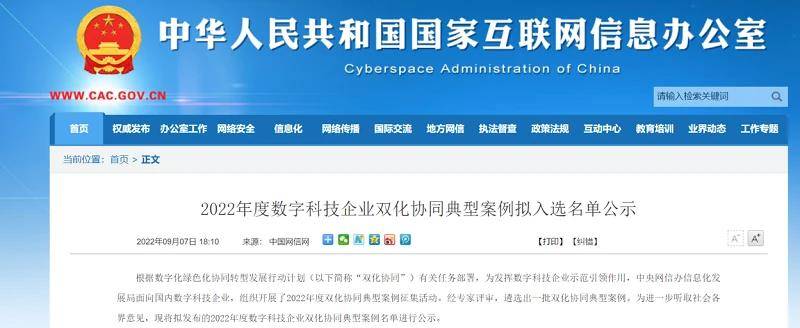 9月7日,中央網信辦信息化發展局公示2022年度數字科技企業雙化協同典型案例擬入選名單,廣域銘島入圍名單。