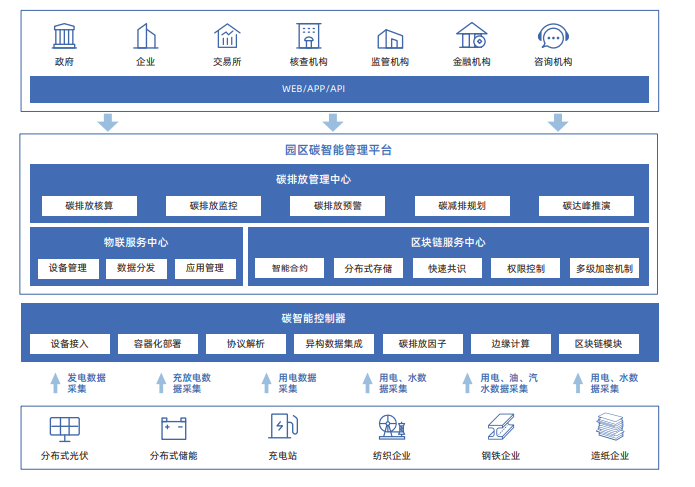 江行智能工業園區“雙碳”管理方案以雙碳目標為引領,以園區能源流和碳流監控管理為基礎,以綠色節能降碳和產業經濟服務為核心,以數據為驅動,構建工業園區碳智能管理平臺,部署具備區塊鏈分布式賬本的碳智能控制器,在數據采集源頭保證碳排放數據的安全、可信和不可篡改,精準有效開展園區碳排放監管。