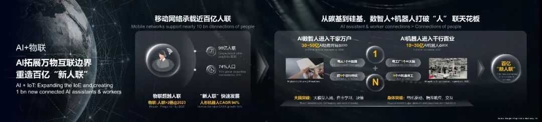 第三,移動AI時代將極大拓展萬物互聯(lián)的邊界。隨著機器獲得類人的思維和移動性能力,網(wǎng)絡(luò)聯(lián)接將從“碳基人”拓展到“硅基人”,再造百億新人聯(lián)。對于個人,未來每個人都將擁有一個AI助理,跨手機、眼鏡和新型AI終端運行。AI數(shù)智人從工具進化為伙伴,實時響應(yīng)生活、工作、學習全場景需求;對于行業(yè),每一個智慧工廠將配備AI大腦,驅(qū)動AI機器員工深入各生產(chǎn)環(huán)節(jié)。AI機器員工將具備自主學習和精準響應(yīng)的能力,使能生產(chǎn)、維護、質(zhì)檢、物流等全場景提質(zhì)增效。“數(shù)智人”和“機器人”將突破傳統(tǒng)聯(lián)接天花板,創(chuàng)造數(shù)百億的“新人聯(lián)”,引領(lǐng)人機融合的新紀元。