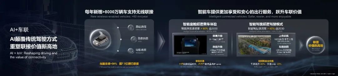 第二,智能網(wǎng)聯(lián)汽車將顛覆傳統(tǒng)駕駛方式,提供更加愉悅和安心的出行服務(wù)。智能座艙,將顛覆人們的乘車體驗。Gbps網(wǎng)絡(luò)體驗支持智慧助手、多屏觀看和XR應(yīng)用等需求,使車輛成為集休閑、娛樂和工作于一體的'移動第三空間'。智能駕駛,將顛覆傳統(tǒng)的駕駛模式。通過每月百GB的數(shù)據(jù)上傳訓練,智駕系統(tǒng)不斷提高模型準確性,精準識別和響應(yīng)多樣化交通環(huán)境;同時,基于毫秒級的車路協(xié)同,將實時提供穩(wěn)定可靠的駕駛策略。智能網(wǎng)聯(lián)汽車將兌現(xiàn)車聯(lián)體驗價值,進一步帶來時間價值和安全價值,重塑聯(lián)接價值的新高地。