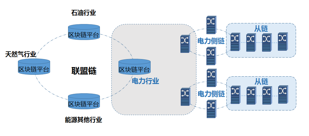 能源區塊鏈平臺以聯盟鏈架構為基礎,采用“主、側、從”多鏈混合模式(見圖1),構建覆蓋電力、石油、天然氣等各類能源業務應用的區塊鏈公共服務平臺,為能源行業跨地域、跨企業的多方協同與信任傳導提供支撐。